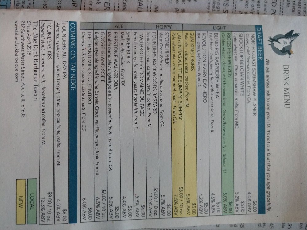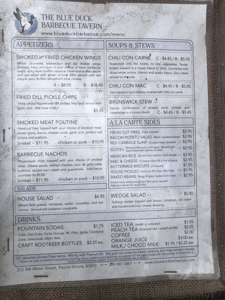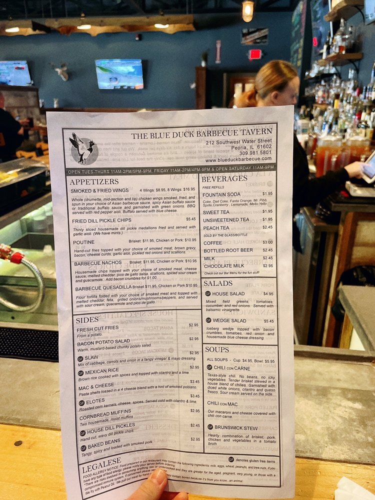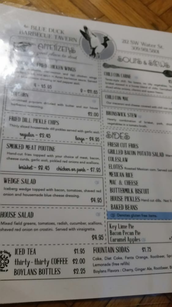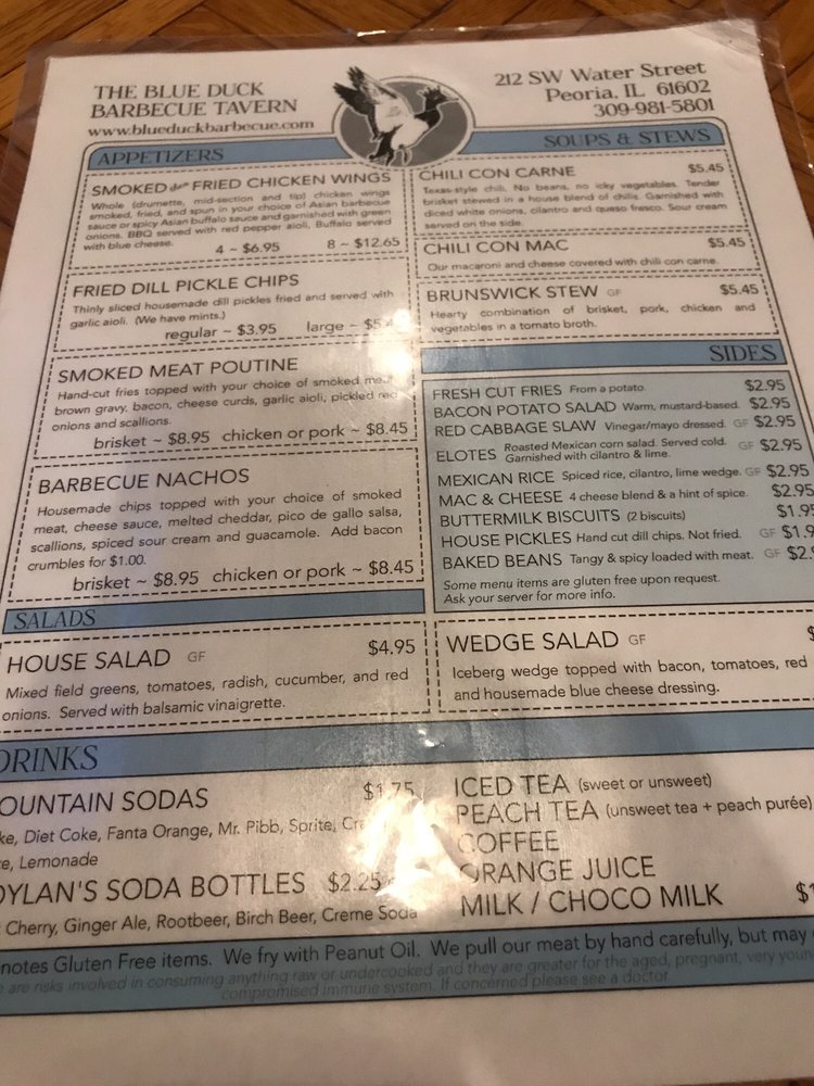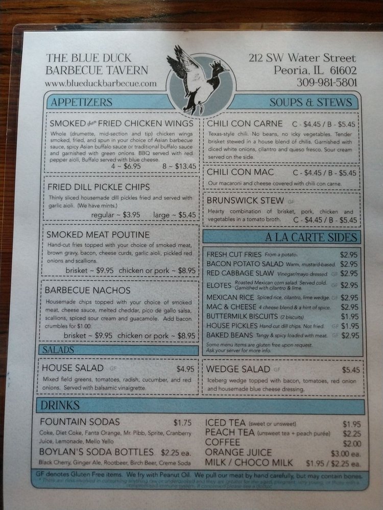 Introducing The Blue Duck Barbecue Tavern, a trendy gastropub in Peoria, IL, known for its New American BBQ cuisine. This restaurant offers a variety of amenities, including delivery, takeout, and outdoor seating. Their menu features flavorful appetizers like smoked & fried chicken wings, fried dill pickle chips, and smoked meat poutine. For salads, they offer a house salad and a classic wedge salad. Don't miss out on their hearty soups and stews, such as chili con carne and Brunswick stew. With options for vegetarians and a welcoming atmosphere for groups and families, The Blue Duck Barbecue Tavern is a must-visit for lunch or dinner. The full bar and happy hour specials add to the appeal of this dining destination.
