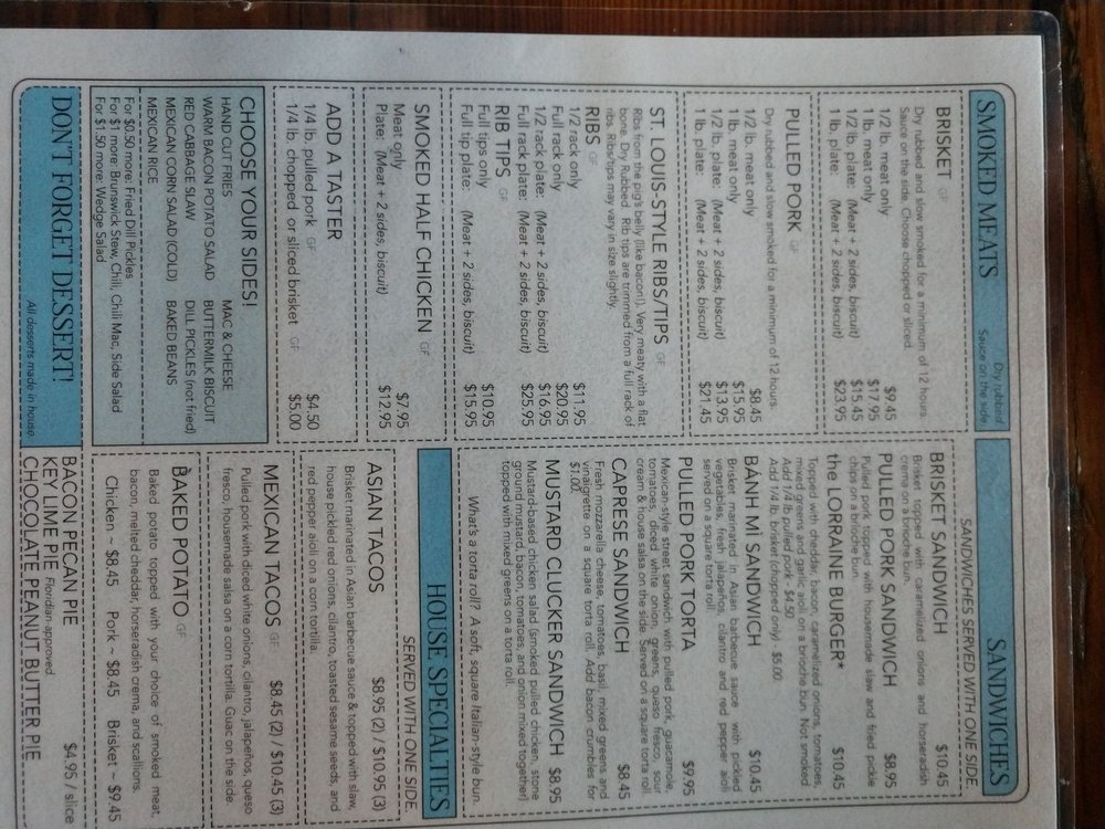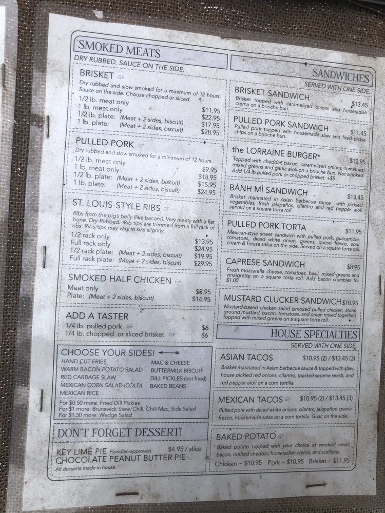 Dry rubbed beef brisket slow smoked for a minimum of 12 hours. Plate = meat, your choice of 2 sides plus a housemade buttermilk biscuit. BBQ sauce on the side.